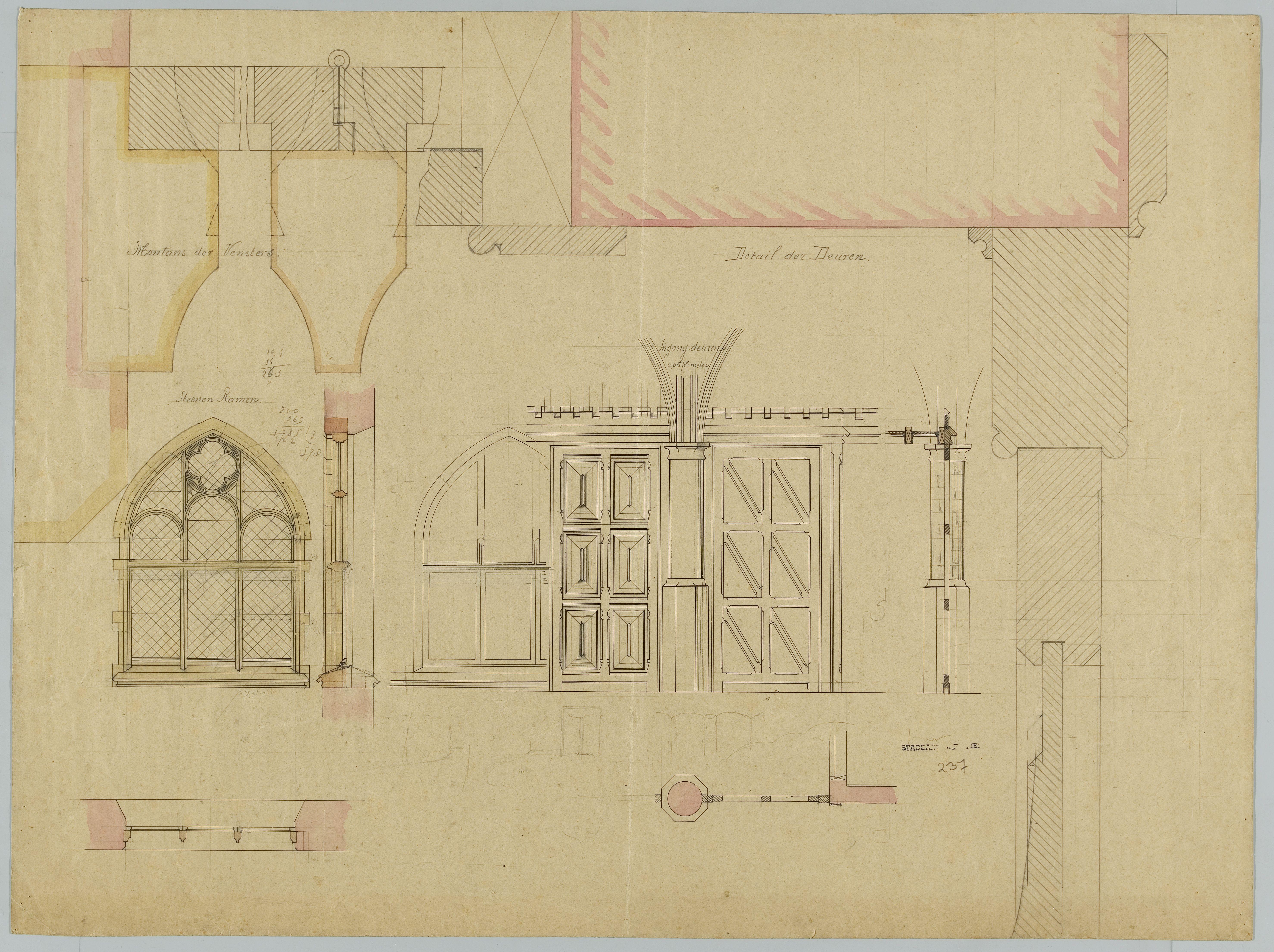 Tekening: Detail van een inkomdeur en van ramen (St.-Gummaruskerk?)