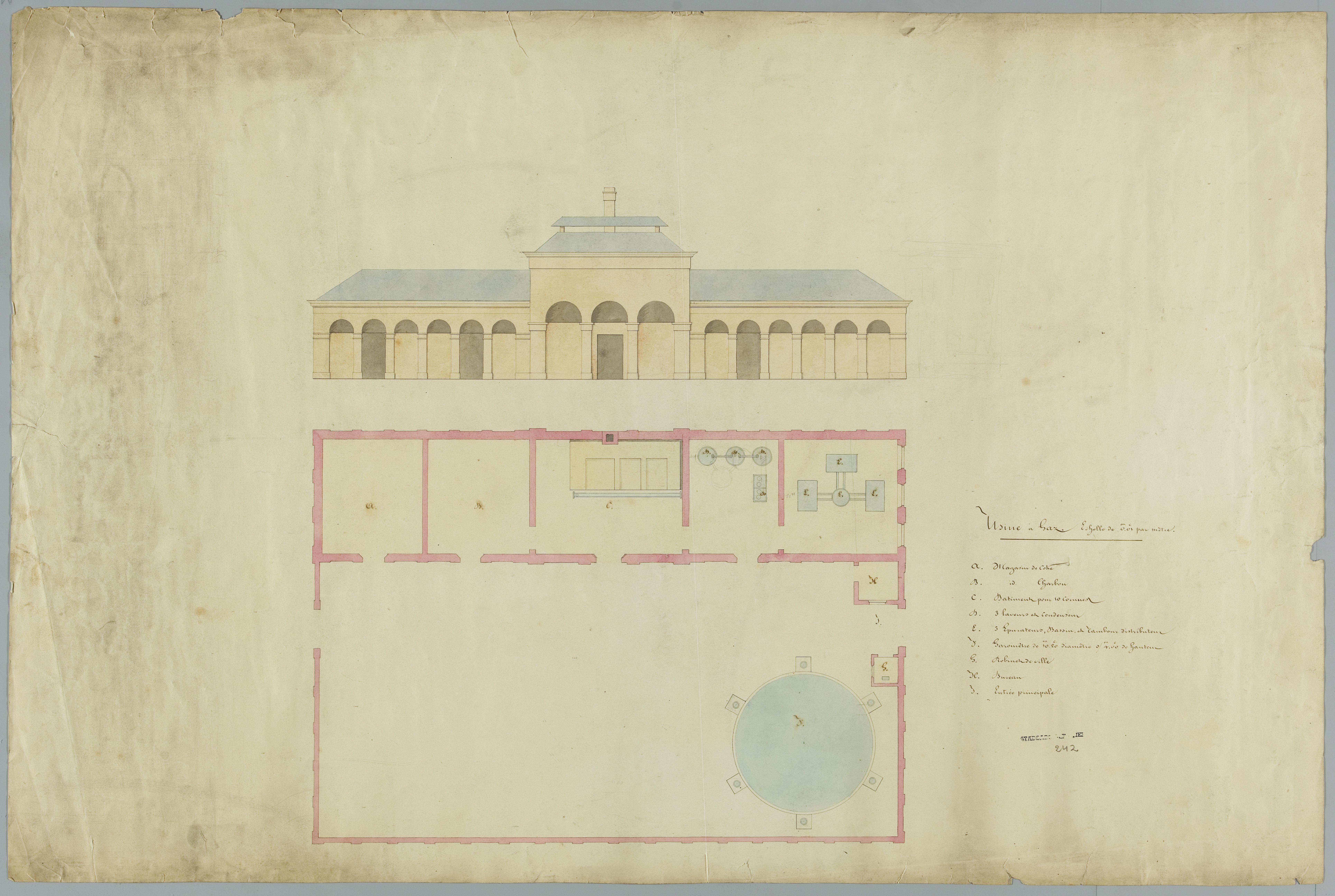 Bestanddeel ICONO_242 - Tekening: Voorgevel en plattegrond van de gasfabriek (1/100)
